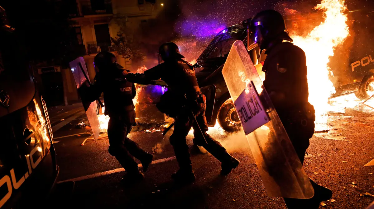 O terceiro dia de protestos na Catalunha ficou marcado por actos violentos contra a polícia. Grupos de homens encapuzados atiraram ácido contra os mossos de esquadra, pedras, cocktails molotov e até material piroténico foi arremessado contra o helicópetero que sobrevoava a zona. Eram menos que na noite anteior, mas mais agressivos, dizem as autoridades. Resultado: 20 detidos e mais de 50 feridos, entre eles vários agentes da polícia e jornalistas.