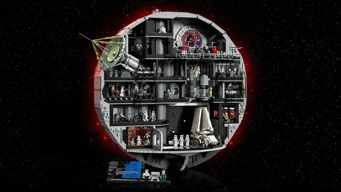 A Estrela da Morte, da coleção da guerra das estrelas, é um dos maiores conjuntos da Lego, com 70 centímetros de altura e 79 centímetros de largura. O desafio para chegar ao resultado final é montar 9.023 peças e, ainda, colocar no espaço, 38 mini figuras.