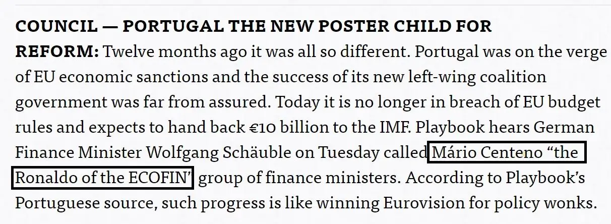 No parágrafo dedicado a Portugal pode ler-se: "Há doze meses, era tudo tão diferente. Portugal estava à beira das sanções económicas da União Europeia e o sucesso do seu novo Governo de coligação de esquerda estava longe de ser assegurado. Hoje, já não viola as regras orçamentais da UE e espera entregar antecipadamente 10 mil milhões de euros ao FMI", lê-se na newsletter do "Politico".