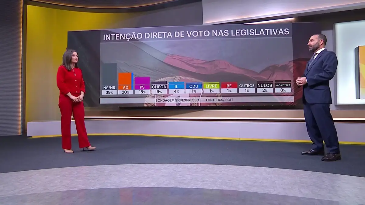 Na primeira sondagem depois da queda do Governo e a dois meses das eleições antecipadas, o trabalho do ICS/ISCTE para a SIC e para o Expresso revela que se as legislativas fossem hoje, a AD venceria com 20% das intenções de voto. O PS ficaria em segundo lugar com 15% e o Chega mantinha-se como terceira força política, com 9%, mas a grande surpresa deste inquérito vai para a percentagem de indecisos que atinge os 39%, o dobro do registado nas últimas legislativas. Na restante distribuição das intenções de voto está a Iniciativa Liberal com 4% dos votos e um empate entre os três partidos às esquerda (CDU, Livre e Bloco de Esquerda).