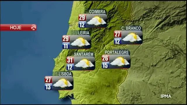Para esta segunda-feira, 10 de abril de 2017 o IPMA prevê céu geralmente pouco nublado, apresentando períodos de maior nebulosidade na faixa costeira a sul do Cabo Espichel até meio da tarde. Vento em geral fraco durante a tarde, soprando moderado a forte (20 a 40 km/h) nas terras altas das regiões Centro e Sul, em especial até ao final da manhã, e no Algarve. Pequena subida da temperatura.