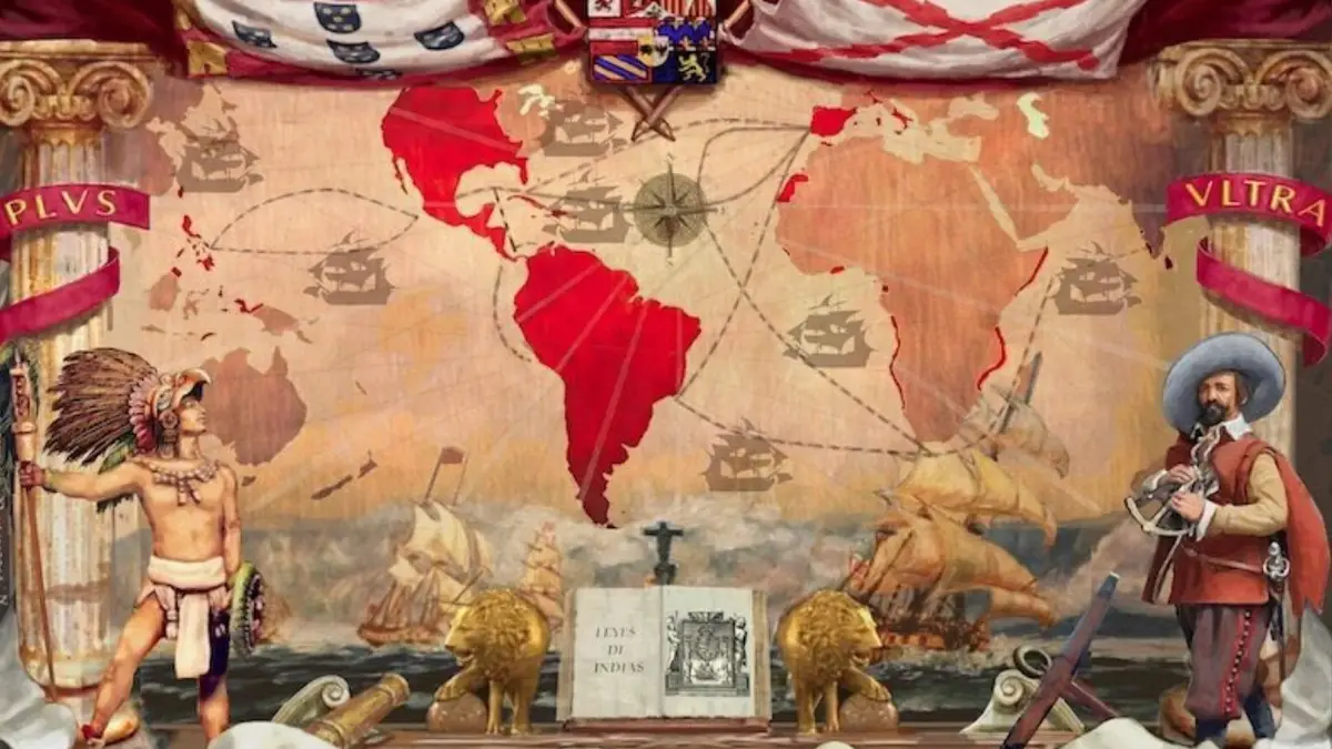 No centro da imagem, encontram-se as conquistas espanholas, que incluem grande parte da América do Norte e da América Latina, mas também