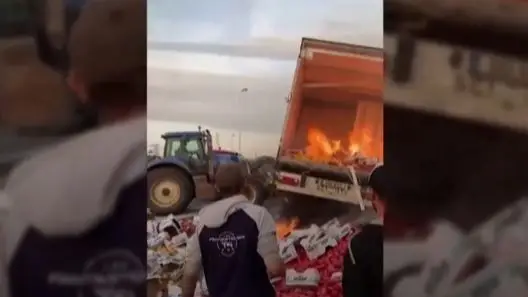 O vídeo divulgado pela agência Reuters mostra o momento, registado na sexta-feira, em que os agricultores incendeiam e abalroam um camião carregado com pimentos em Narbonne, no Sudoeste do país.