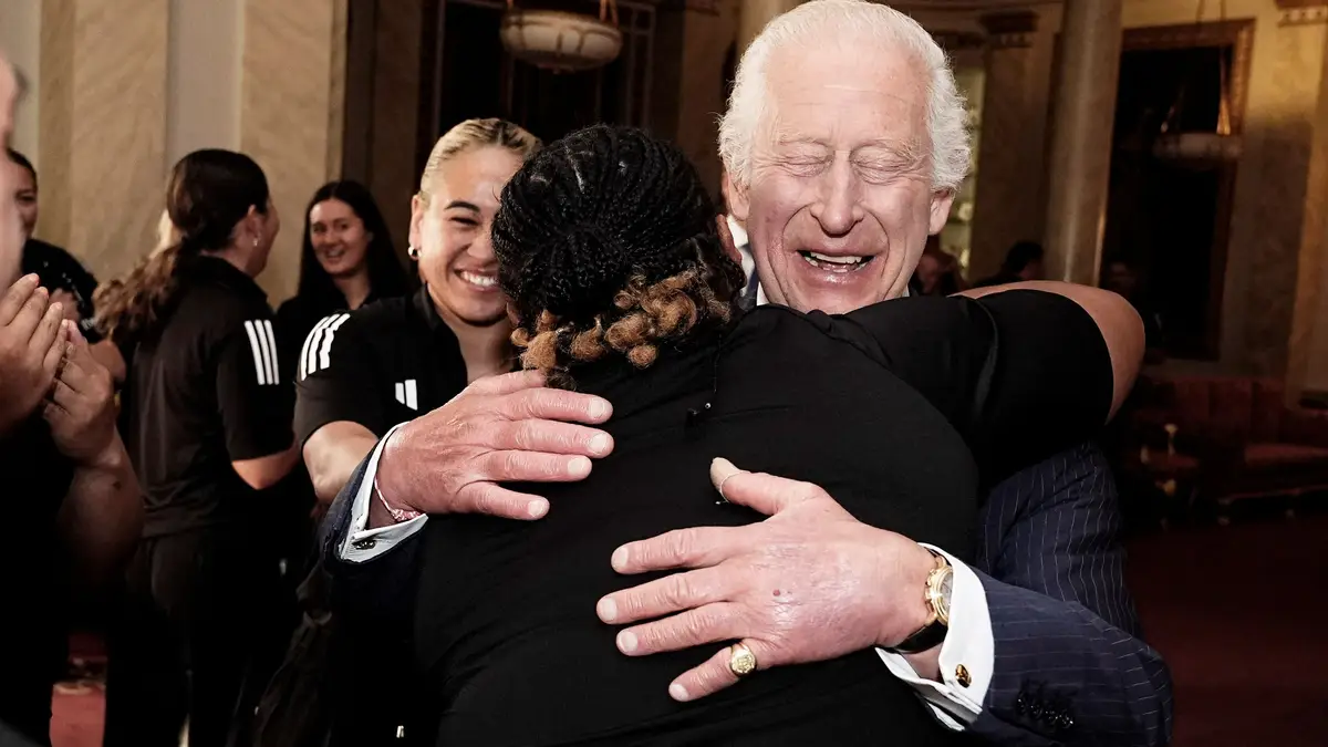 O rei Carlos III, de Inglaterra, foi surpreendido com um abraço das jogadoras da seleção feminina de râguebi da Nova Zelândia.
