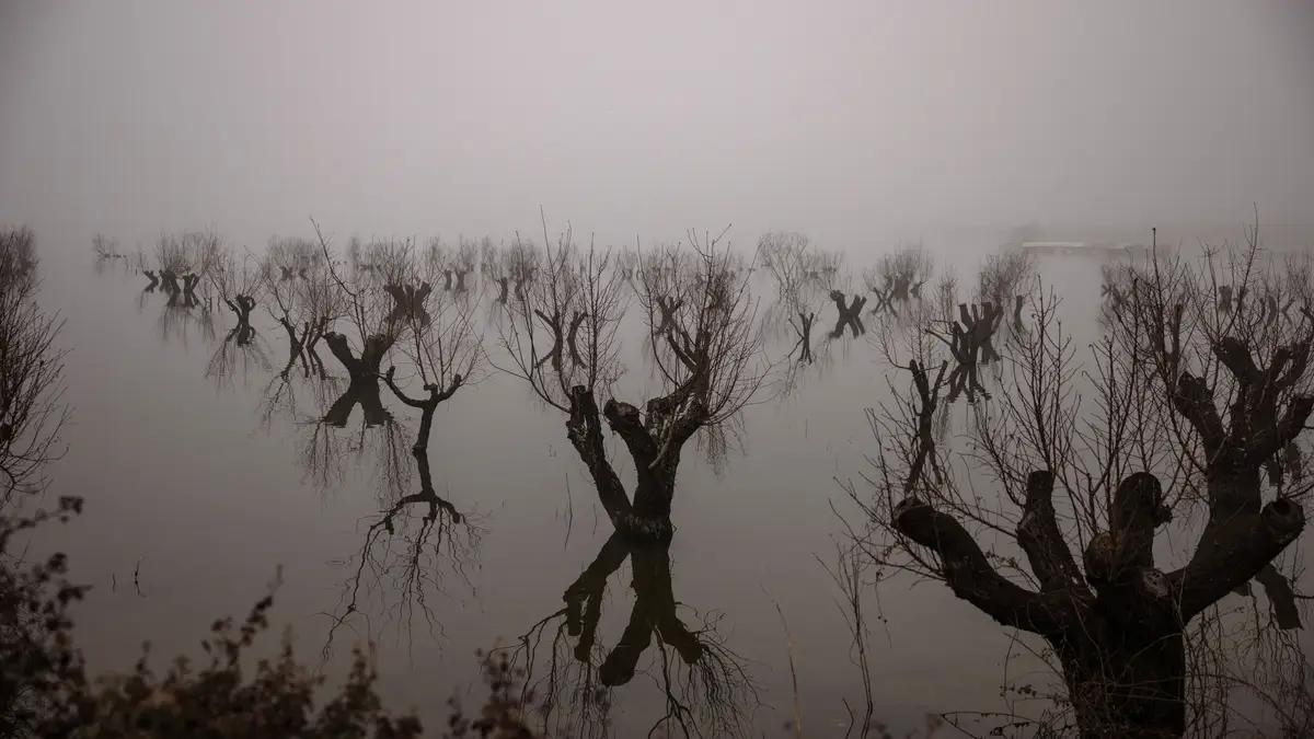 Num pequeno barco a motor, o agricultor Babis Evangelinos desliza sobre as terras que outrora cultivou na planície da Tessália, no centro da Grécia, passando pelos troncos das suas amendoeiras sem fruto submersas pelas águas das cheias.