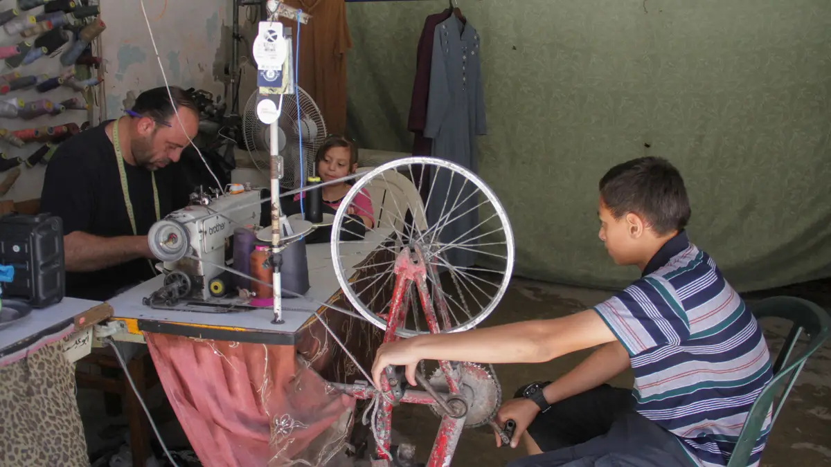 Sem fábrica, nem energia, era difícil voltar à produção de roupa. Mas Saad arranjou uma solução. Usou tijolos e tecido para montar uma máquina de costura cuja fonte de energia é uma bicicleta.