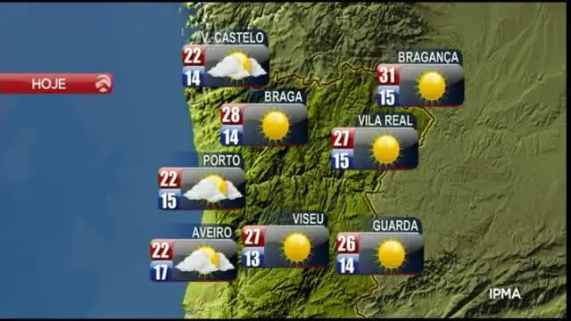 No que diz respeito às temperaturas, em Lisboa vão oscilar entre 17 e 26 graus Celsius, no Porto entre 15 e 22, em Viseu entre 13 e 27, em Vila Real entre 15 e 27, em Bragança entre 15 e 31, na Guarda entre 14 e 26, em Coimbra entre 16 e 26, em Castelo Branco entre 18 e 33, em Portalegre entre 16 e 31, em Santarém entre 15 e 29, em Évora e Beja entre 15 e 34, em Faro entre 21 e 37, no Funchal entre 20 e 26, em Ponta Delgada entre 18 e 26, na Horta entre 21 e 26 e em Santa Cruz das Flores entre 20 e 25.