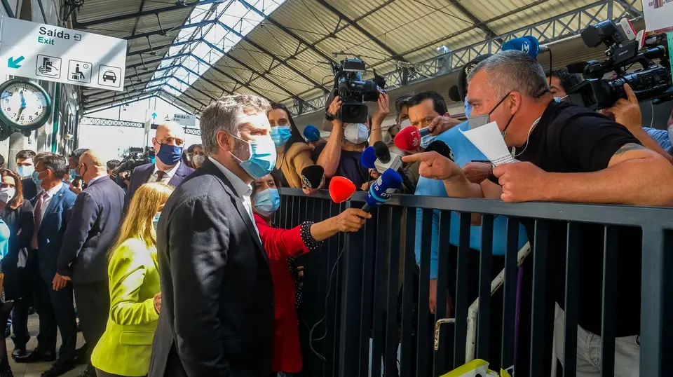 À saída do comboio, um protesto de trabalhadores das infraestruturas de Portugal aguardava a comitiva do Governo para exigir uma reunião com o Executivo. Pedro Nuno Santos trocou algumas palavras acesas com um representante dos manifestantes.