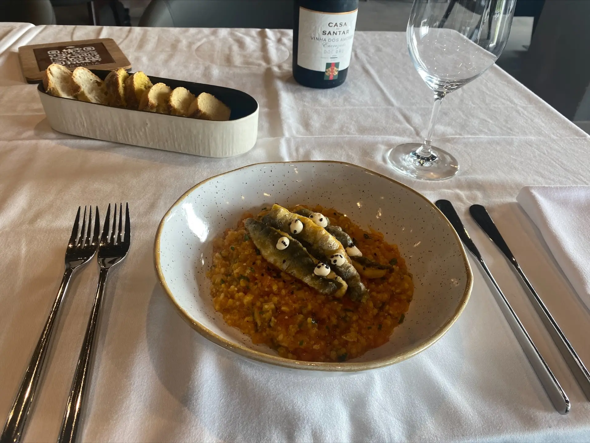 Neste prato, o conceito respeita o passado e valoriza a denominação de origem dos vinhos do Dão, num encruzado vinho branco fresco a fazer lembrar a frescura com que a região encara atualmente os mercados.