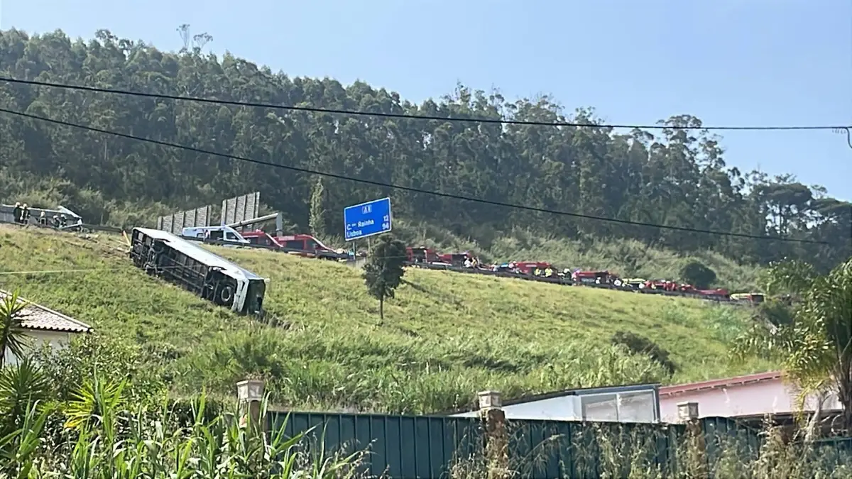 Um camião de transporte de mercadorias embateu esta sexta-feira na traseira de um autocarro escolar na A8, em Alfeizerão, Alcobaça, tendo o autocarro acabado tombado numa ravina ao lado da autoestrada.