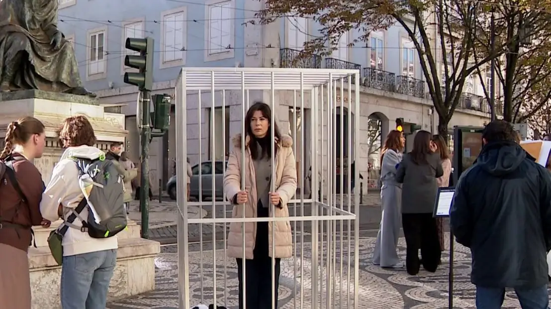 O Largo do Chiado, em Lisboa, foi o palco de uma instalação artística que assinala, esta terça-feira, o Dia Internacional para a Eliminação da Violência contra as Mulheres.